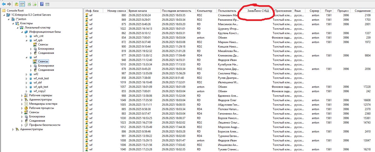 *конкретно тут в консоли сервера 1С на антоне можно увидеть конкретный сеанс вредитель и его убить. У него тут цифры будут овер 1000